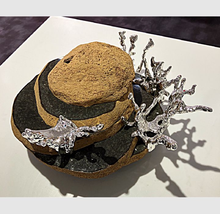 流動体が重力に逆らって上昇する様子をデジタルシミュレーションで造形し、3D スキャンした石と組み合わせることで、生命の上昇する力と、物質が重力に従って落ちる力を、ひとつの形に結晶化させた。
