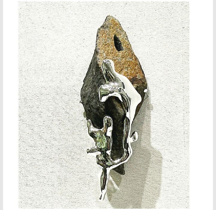 流動体が重力に逆らって上昇する様子をデジタルシミュレーションで造形し、3D スキャンした石と組み合わせることで、生命の上昇する力と、物質が重力に従って落ちる力を、ひとつの形に結晶化させた。
