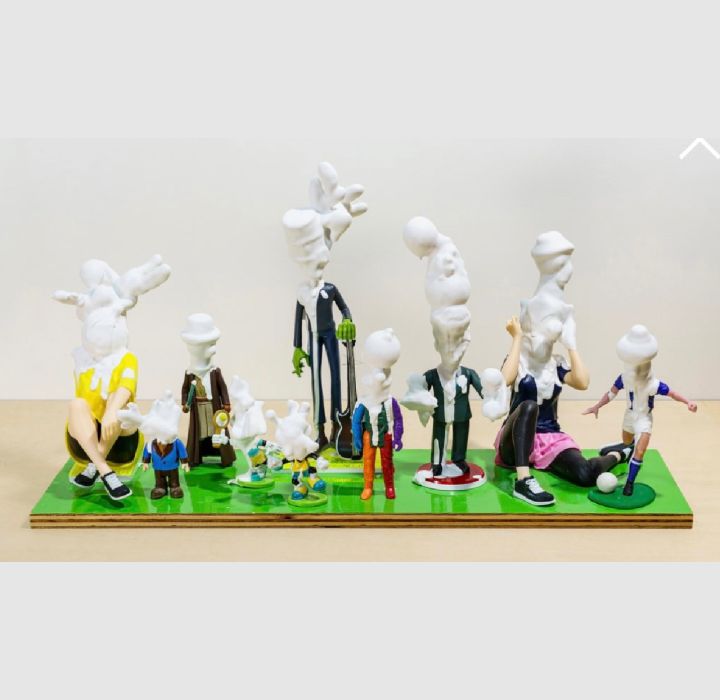 さまざまなフィギュアに白い樹脂をかけることで、バラバラな個性が多様なままグループに見えてしまうという作品群。